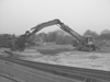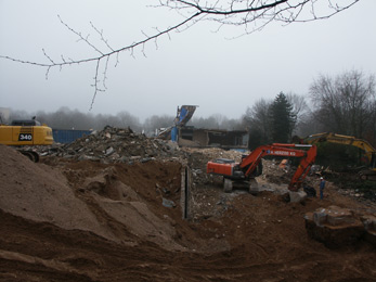 Nach Entscheidung über den Abbruch erhielten wir Anfang Oktober 2008 den Auftrag zum Planung und Durchführung des Abbruchs, sowie zur Wiederherrichtung des Geländes. Ausgenommen wurde das Freibad und die dazugehörigen Nebengebäude. In einem Zeitraum von 3 Monaten galt es den Abbruch zu realisieren. Neben dem Antrag auf Abbruch wurde der Rückbau mit den Versorgern, den Behörden und Betreibern abgestimmt. Nach beschränkter Ausschreibung wurde das Abbruchunternehmen Stops mit Herzog als Arge beauftragt. Bedingt durch Verzögerungen bei der Abbruch-Genehmigung und durch unerwartetes Grundwasser verzögerte sich das Ausführungsziel um 6 Wochen. Nach Abbruch aller Gebäudeteile wurde das Gelände neu modelliert und eingeebnet. In der ersten Märzwoche konnte das gesamte Gelände zufriedenstellend übergeben werde.